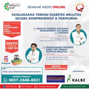 Dalam rangka memperingati Hari Diabetes Dunia yang jatuh pada tanggal 14 November 2022 dan sebagai sarana untuk memberikan up date ilmu dalam pengobatan Diabetes Mellitus, RS Nirmala Suri mengadakan Seminar Medis Online dengan Tema ” Tatalaksana Terkini Diabetes Mellitus secara Komprehensif dan Paripurna” dengan pembicara dr. Mustopa, Sp.PD (dokter Spesialis Penyakit Dalam RS Nirmala Suri) dengan judul Insulin Therapy For Early Management Glicaemic Control dan dr. Agus Budi Utomo, Sp.S (dokter Spesialis Saraf RS Nirmala Suri) dengan judul Penanganan Penyakit Saraf Tepi Terkait Diabetes Mellitus. Acara ini digelar pada Sabtu, 26 November 2022 jam 11.00 secara Hybrid yang dilakukan offline di Aula RS Nirmala Suri dan bisa diikuti online via zoom meeting yang diikuti insyaAlloh kurang lebih 100 peserta.